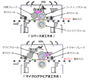 枚葉テストコーターは、リバース塗工方式を採用しています。リバース塗工方式は、基材の厚み誤差に関係なく、樹脂の均一かつ高性能な塗布が可能です。また、マイクログラビア塗工方式への組換えで、幅広いコーティング条件に対応可能です。
